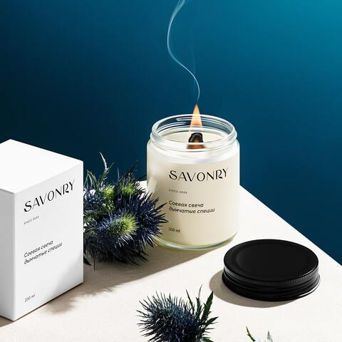 Свечи Savonry изготовлены на растительном соевом воске, который при горении не выделяет вредных веществ. Также этот воск не имеет запаха, легко смешивается с ароматической композицией и полностью передает все тонкости аромата, который при нагревании раскрывается сильнее.