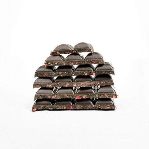 Состав: какао тёртое сорта Криолло, нектар кокосовых соцветий (кокосовый сахар) органический, масло какао натуральное нерафинированное, кешью, спирулина, малина сублимированная, соль розовая гималайская.
