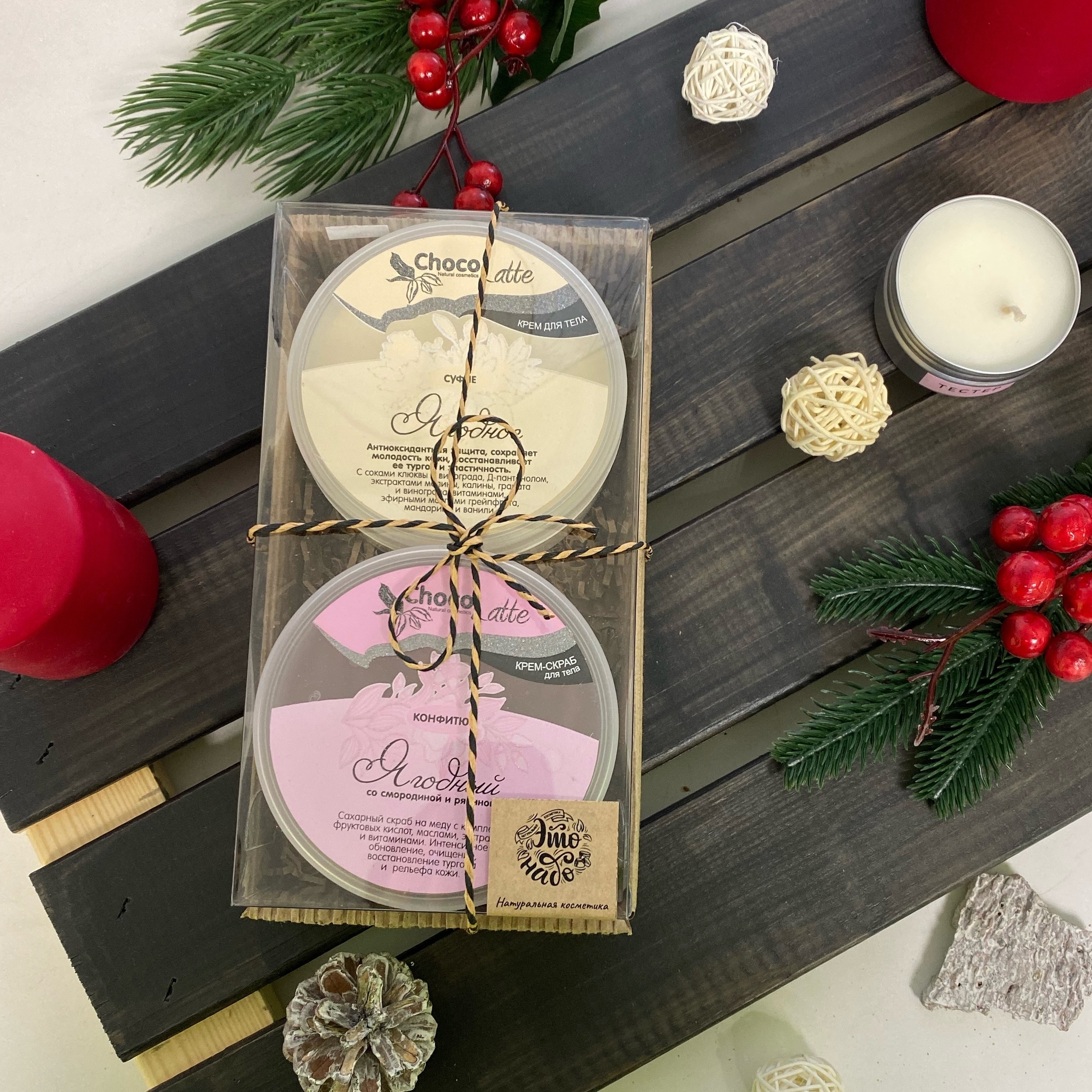 Состав: сахар, масла (ши, какао, оливы, льна, миндальной косточки, авокадо), порошок сока клубники и клюквы, кетон малины, парфюмерная композиция, СО2 экстракты (алоэ вера, яблока, косточки винограда, эхинацеи, корня лопуха), витамины А, E, F.