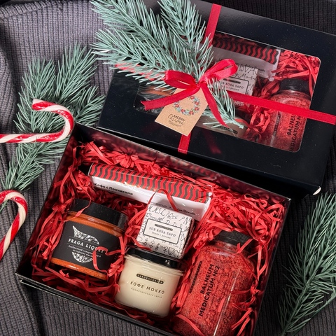 Новогодний набор, заботливо собранный в "Это надо": черная матовая коробка, бумажный наполнитель, лента, новогодняя бирка, украшение в виде большой литой ветки ели (не осыпается)!