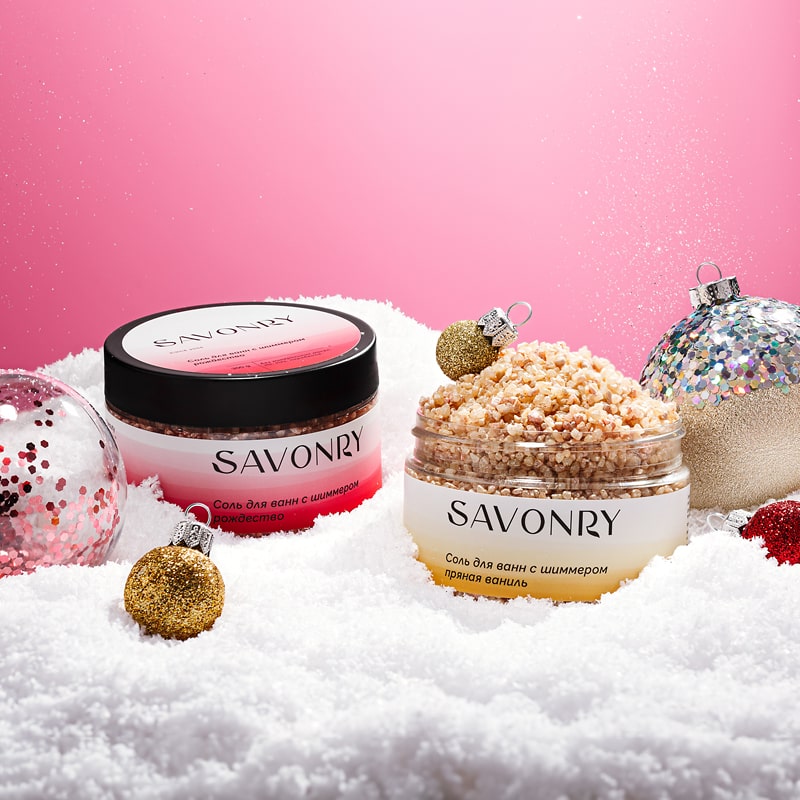 Спа-набор содержит два вида соли с шиммером: "Пряная ваниль" и "Рождество".